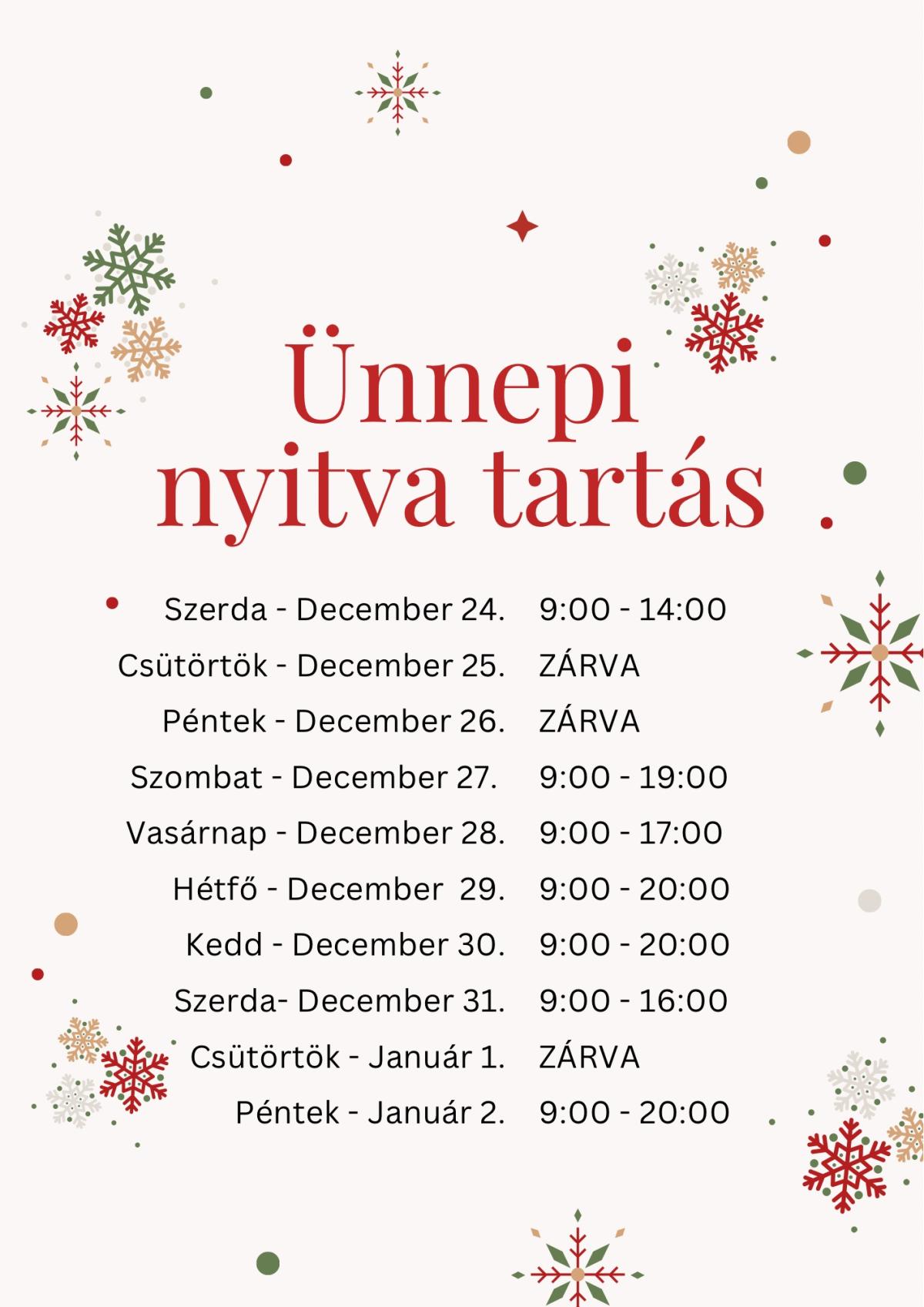 Ünnepi nyitvatartásunk: December 23. 9-20 óráig. December 24-én 9-14 óráig. December 25-26. ZÁRVA.